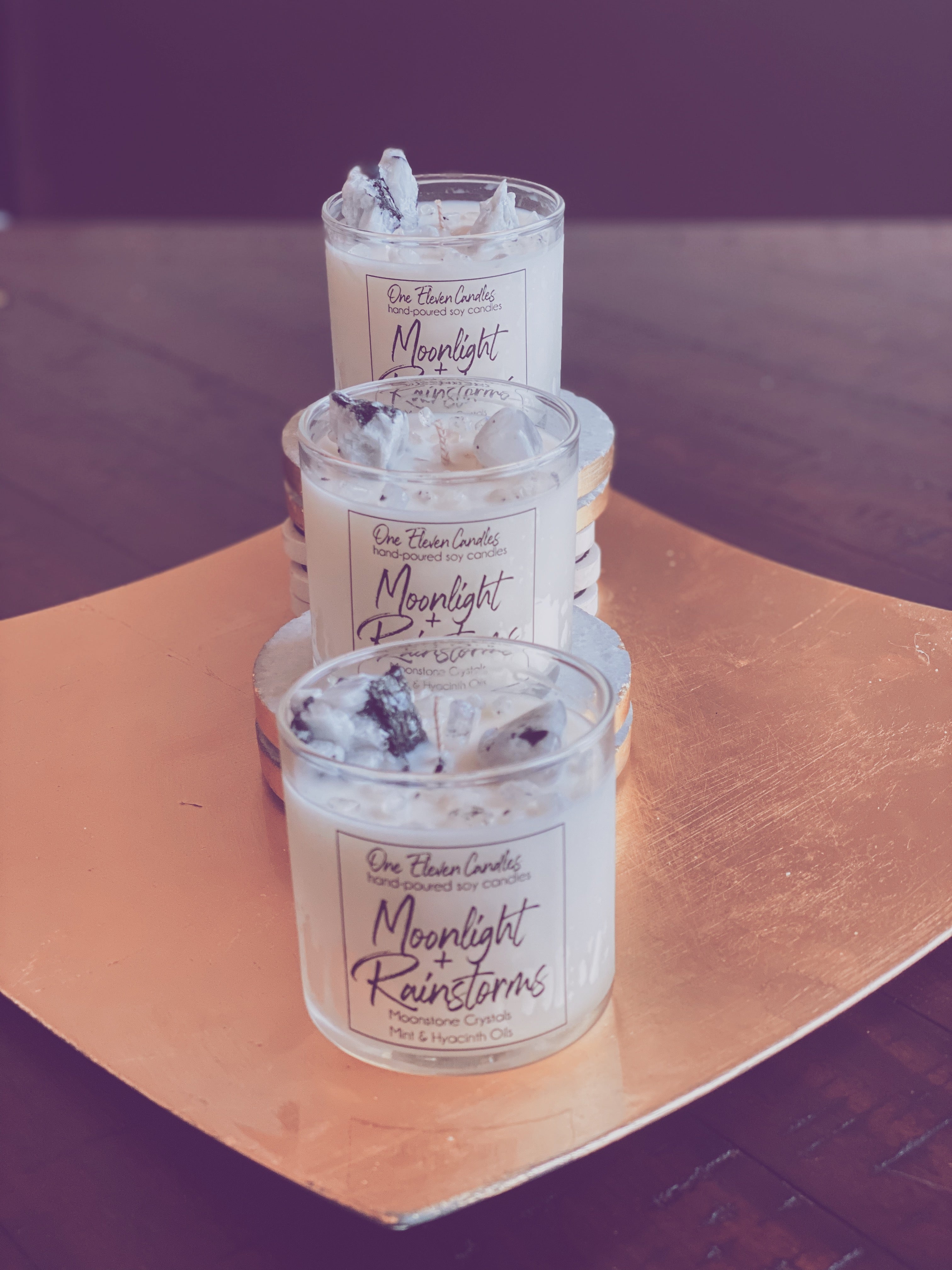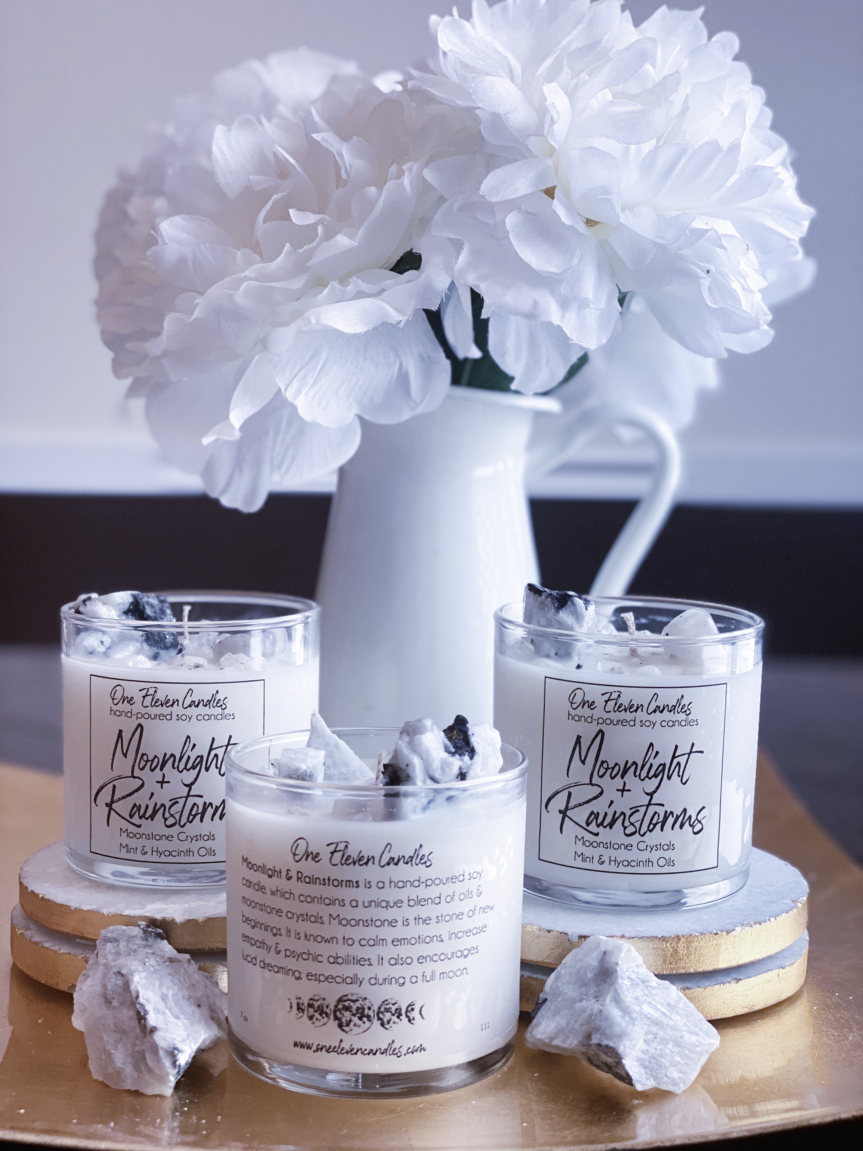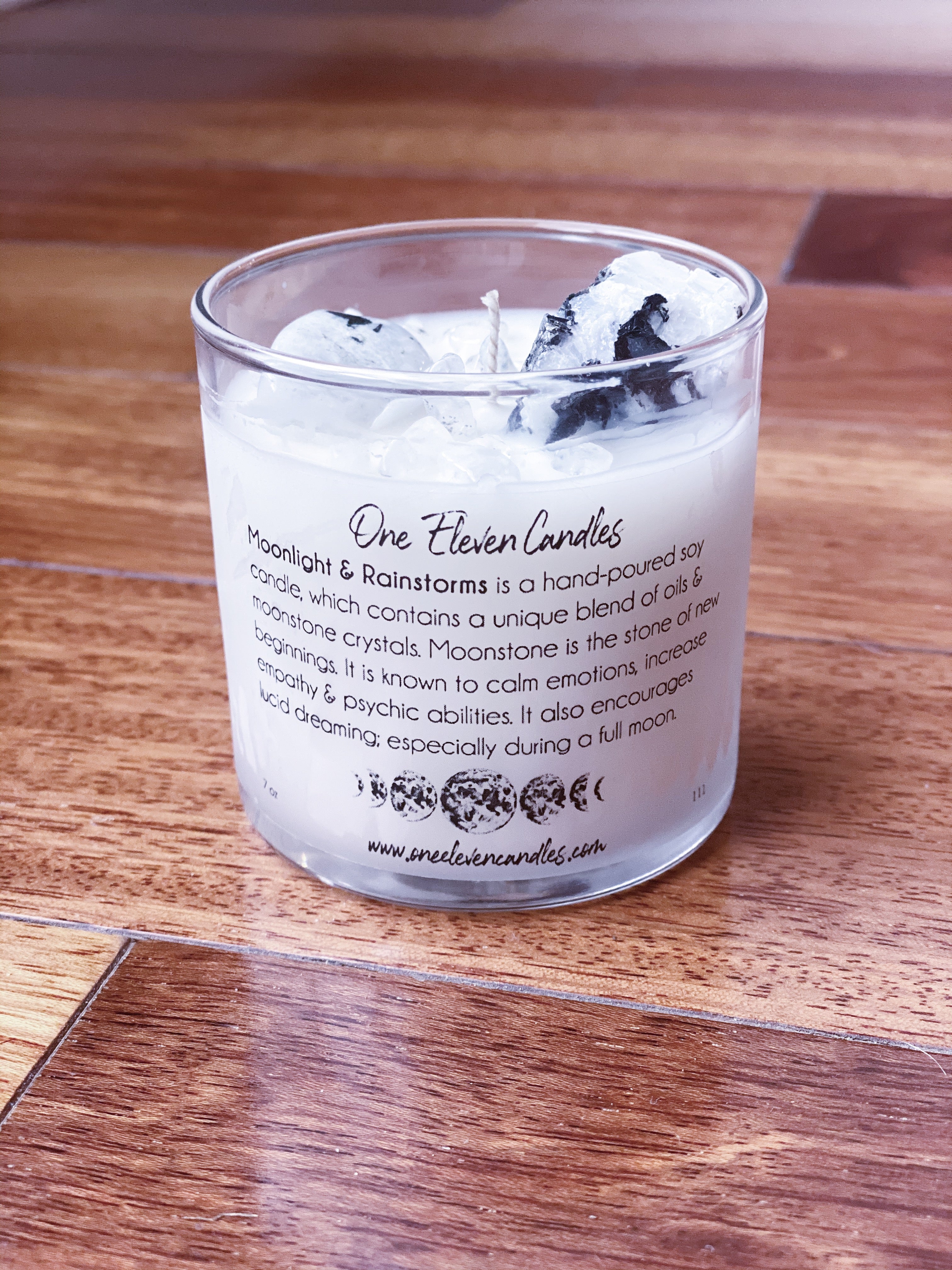Moonlight & Rainstorms is a hand poured soy candle, which contains a unique blend of oils & moonstone crystals. Moonstone is the stone of new beginnings. It is known to calm emotions, increase psychic abilities & empathy. It also encourages lucid dreaming, especially during a full moon.