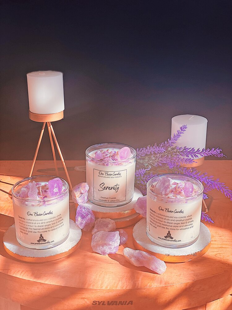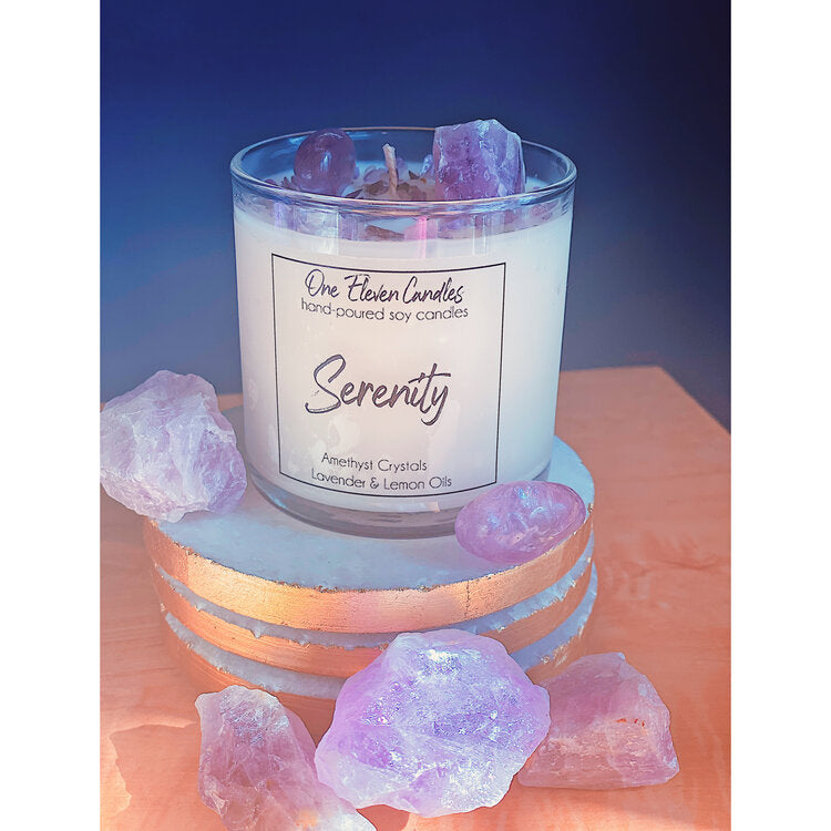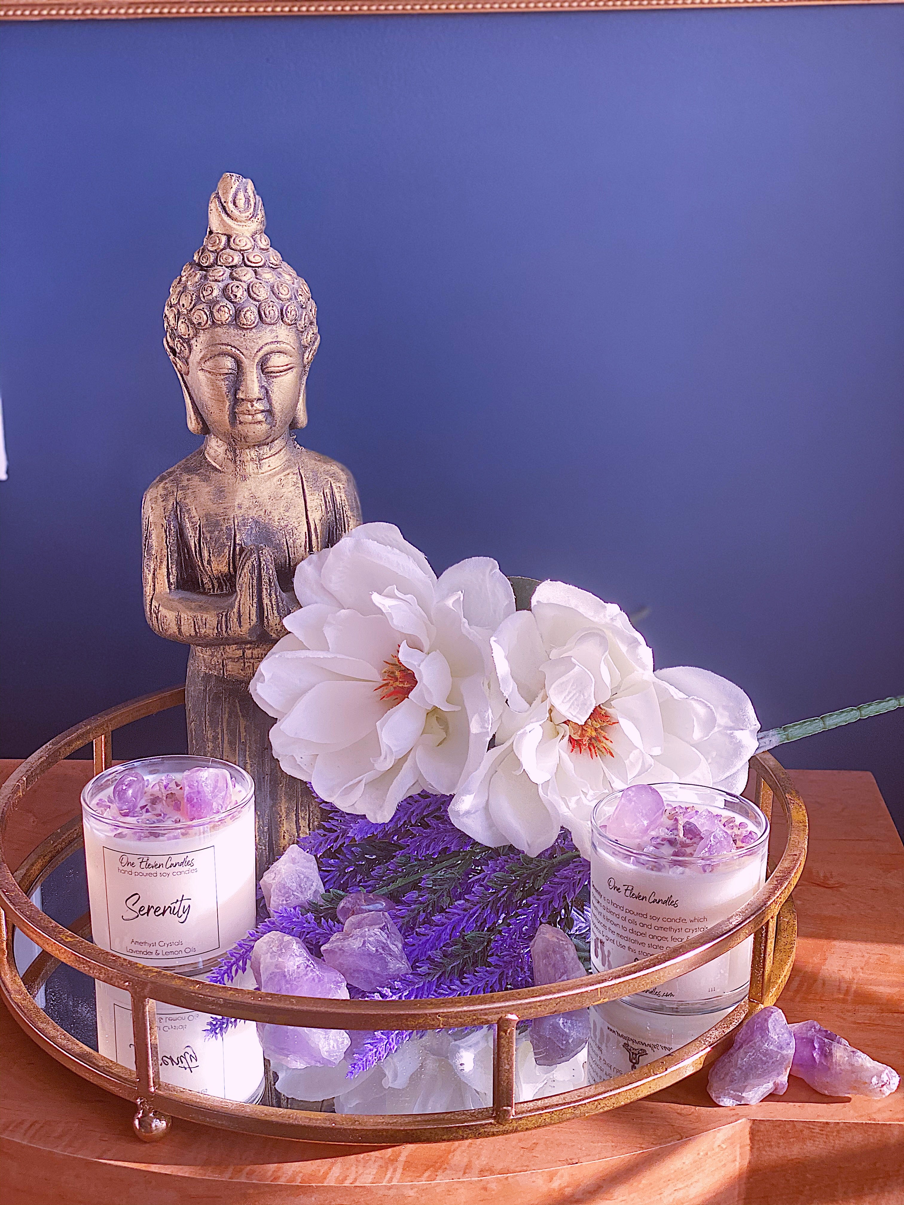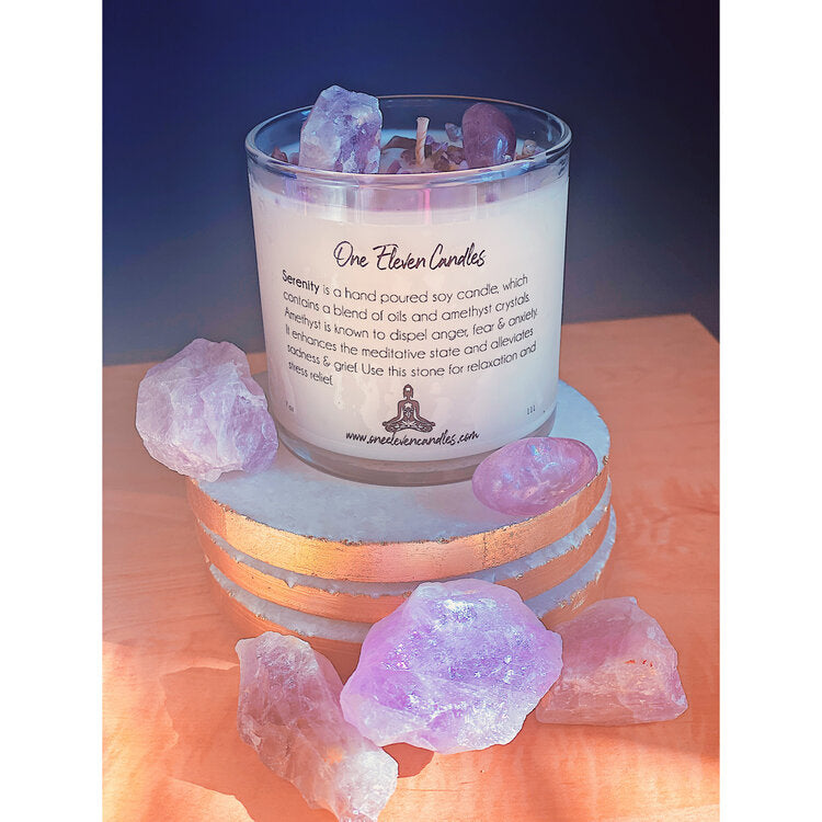 Serenity is a hand poured soy candle, which contains a blend of oils and amethyst crystals. Amethyst is known to dispel anger, fear & anxiety. It also enhances the meditative state and alleviates sadness and grief. Use this stone for relaxation and stress relief.