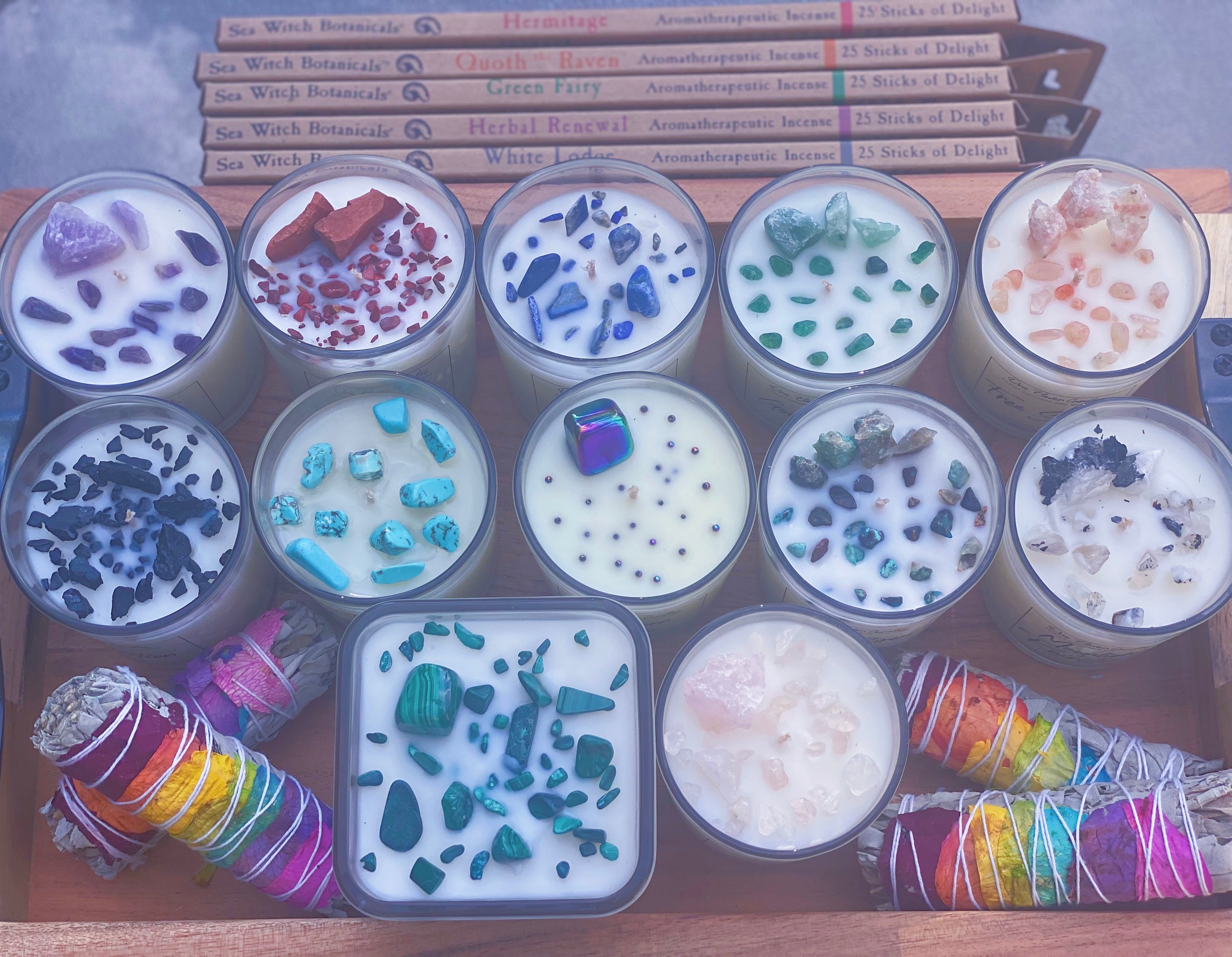 Candles Included: Awakening, Dark Moon, Free Spirit, Good Vibes, Money Magnet, Moonlight & Rainstorms, Protection, Rejuvenate, Sea Siren, Serenity, Soul Enchanted, Sweet Temptation & Unicorn Kisses.