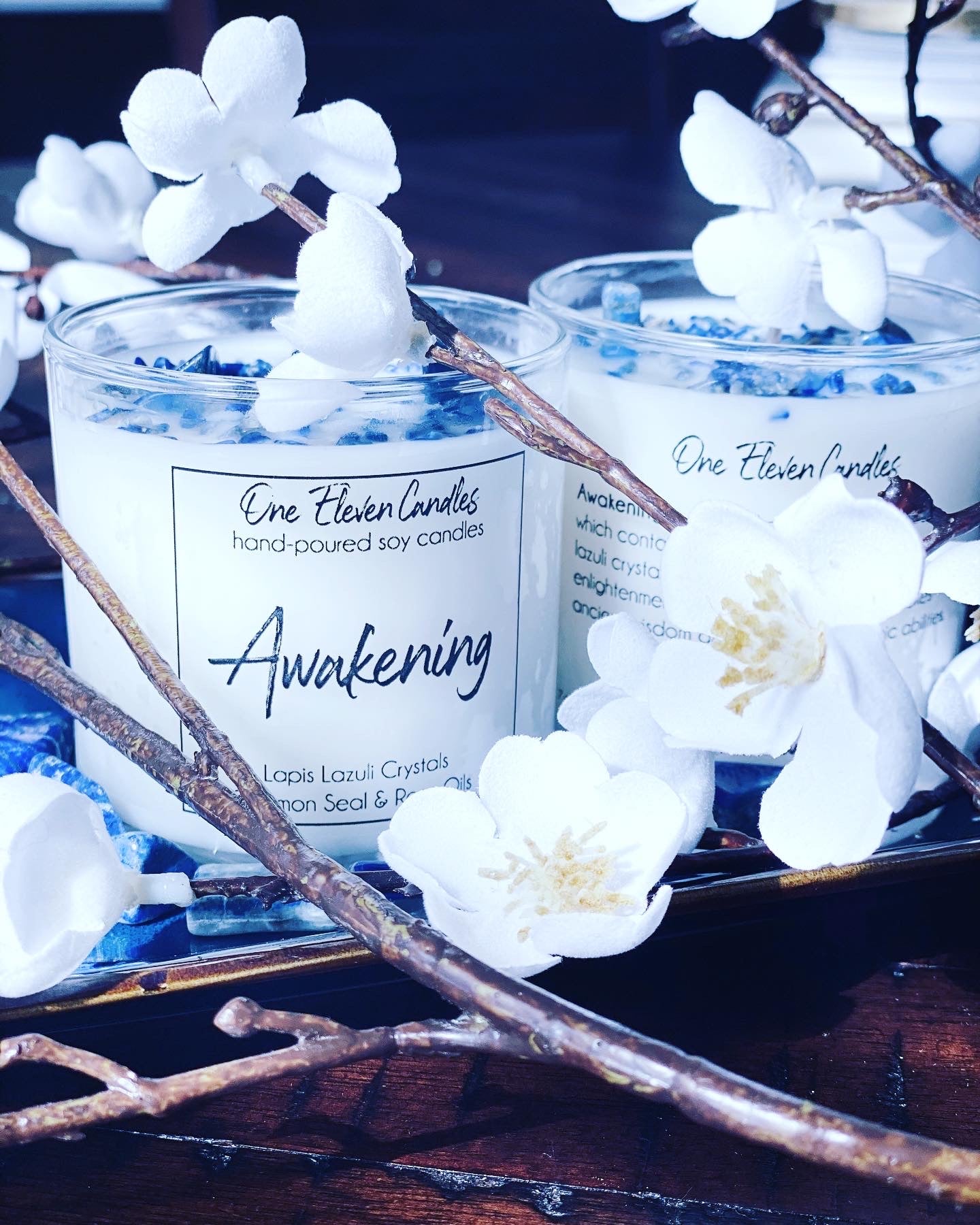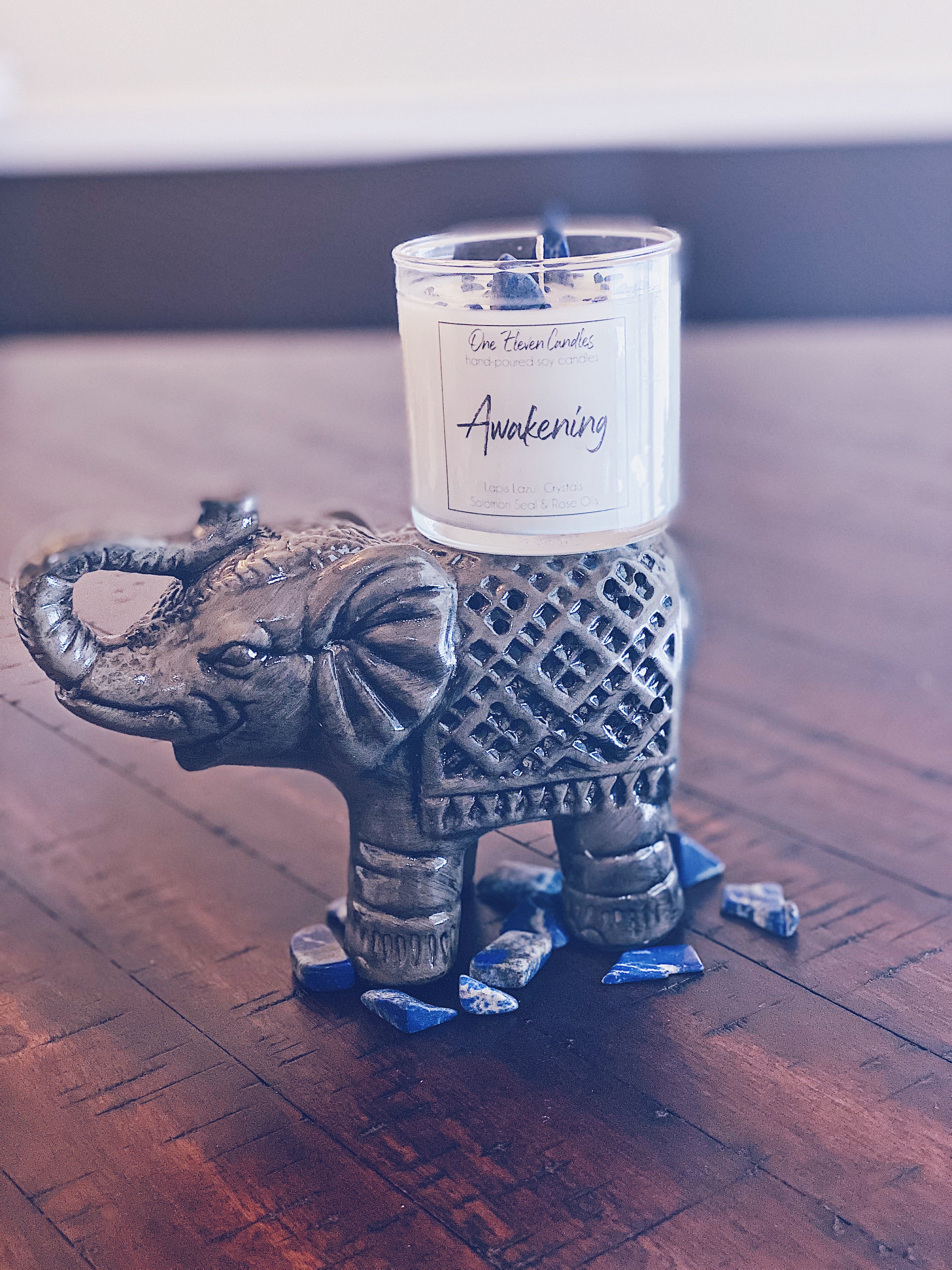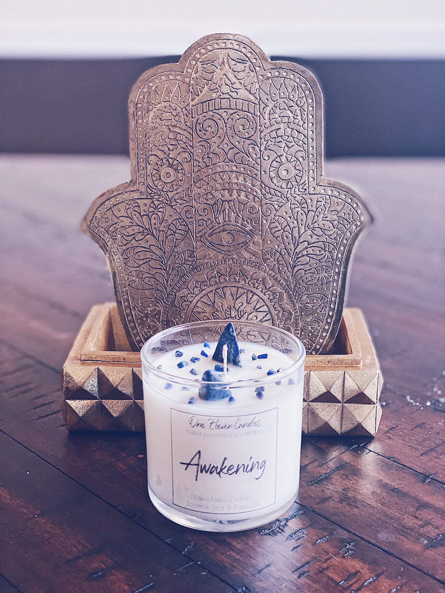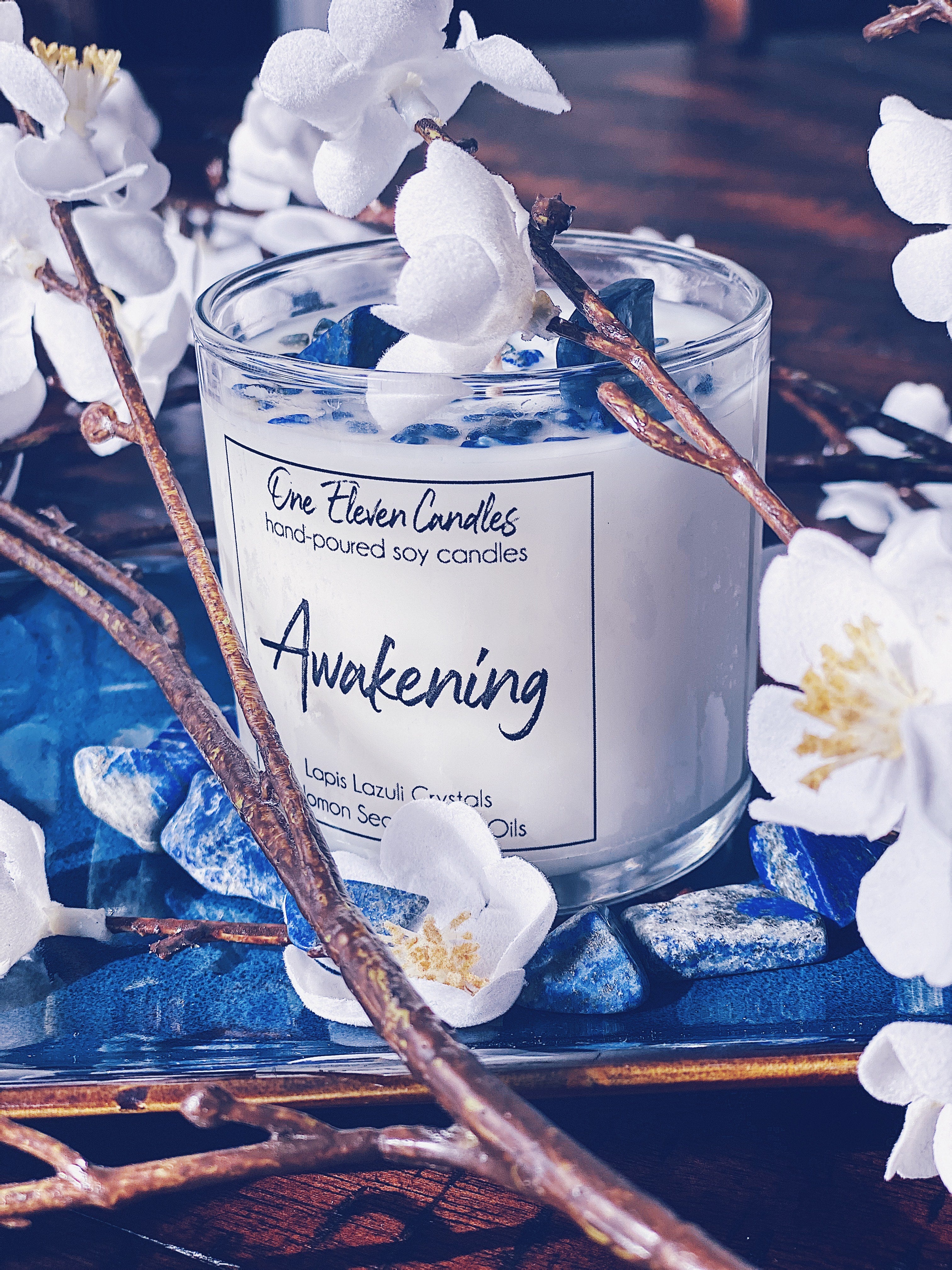 Awakening is a hand-poured soy candle which contains Lapis Lazuli crystals and a unique blend of essential oils. Lapis Lazuli is known to simulate enlightenment. It opens the third eye, invokes ancient wisdom and enhances psychic abilities.