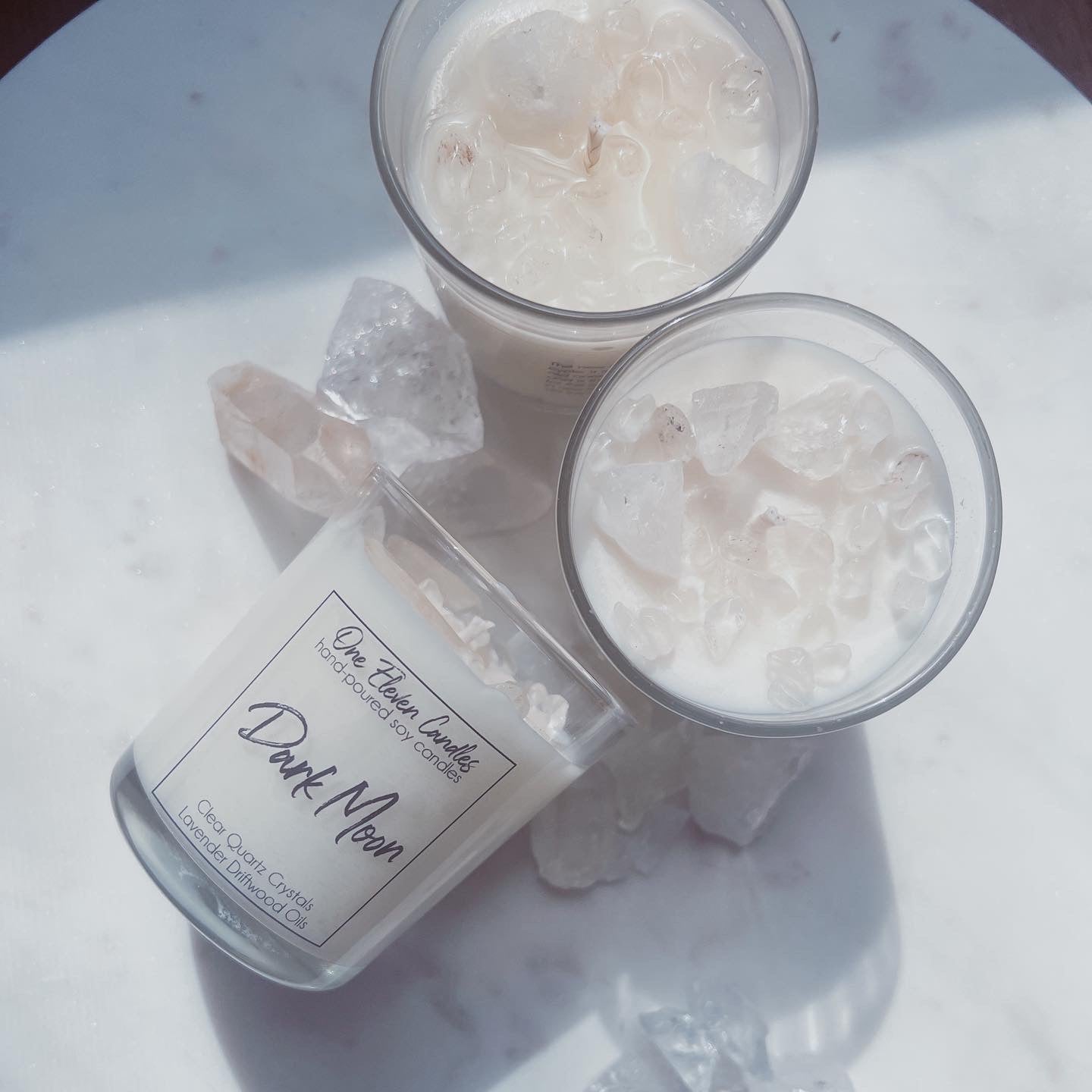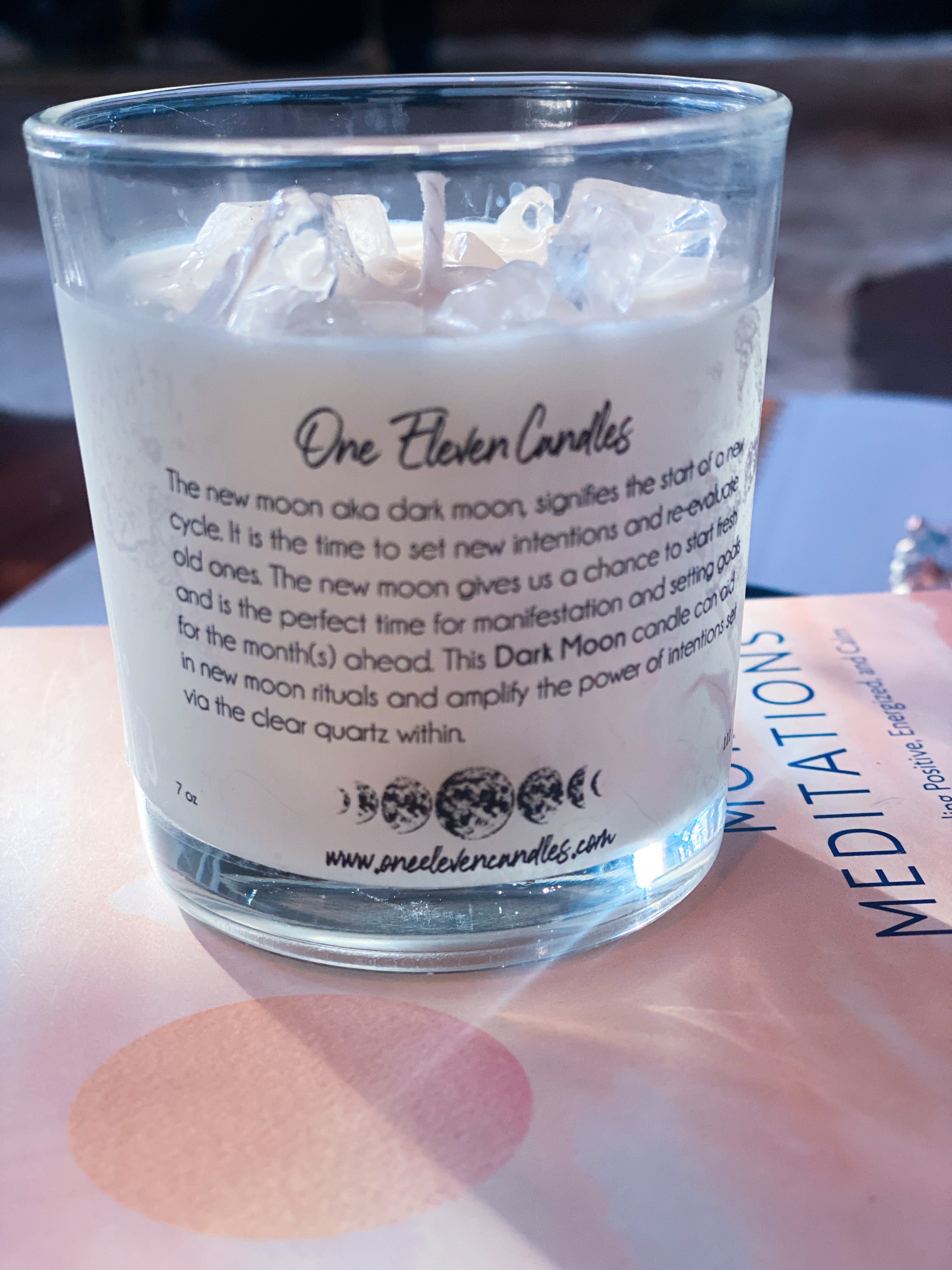 The New Moon or Dark Moon, signifies the start of a new cycle. It is a time to set new intentions and re-evaluate old ones. The new moon gives us a chance to start fresh and is the perfect time for manifestation and setting goals for the month(s) ahead. This Dark Moon candle can aid in new moon rituals and amplify the power of the intentions set via the clear quartz within.