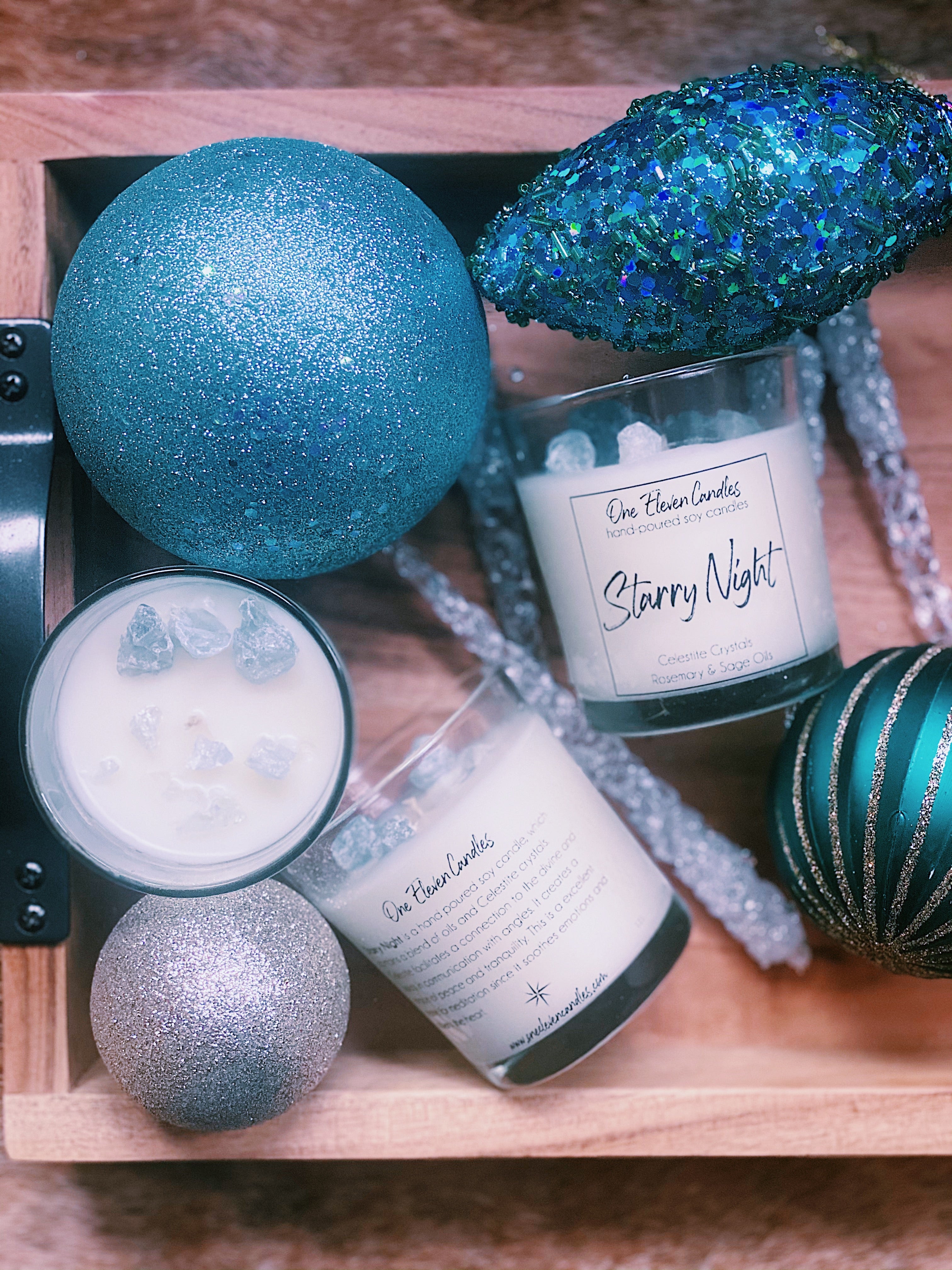 Starry Night is a hand-poured soy candle which contains Celestite crystals and a unique blend of essential oils. Celestite facilitates a connection to the divine and assists in communication with angles. It creates a space of peace and tranquility. This is an excellent stone for meditation since it soothes emotions and opens the heart.